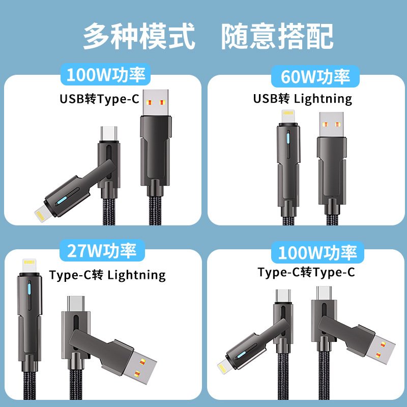 100W 4-in-1 Rotating Fast Charging Cable — USB-C & Lightning, Dual-Ended, Nylon Braided, 2m