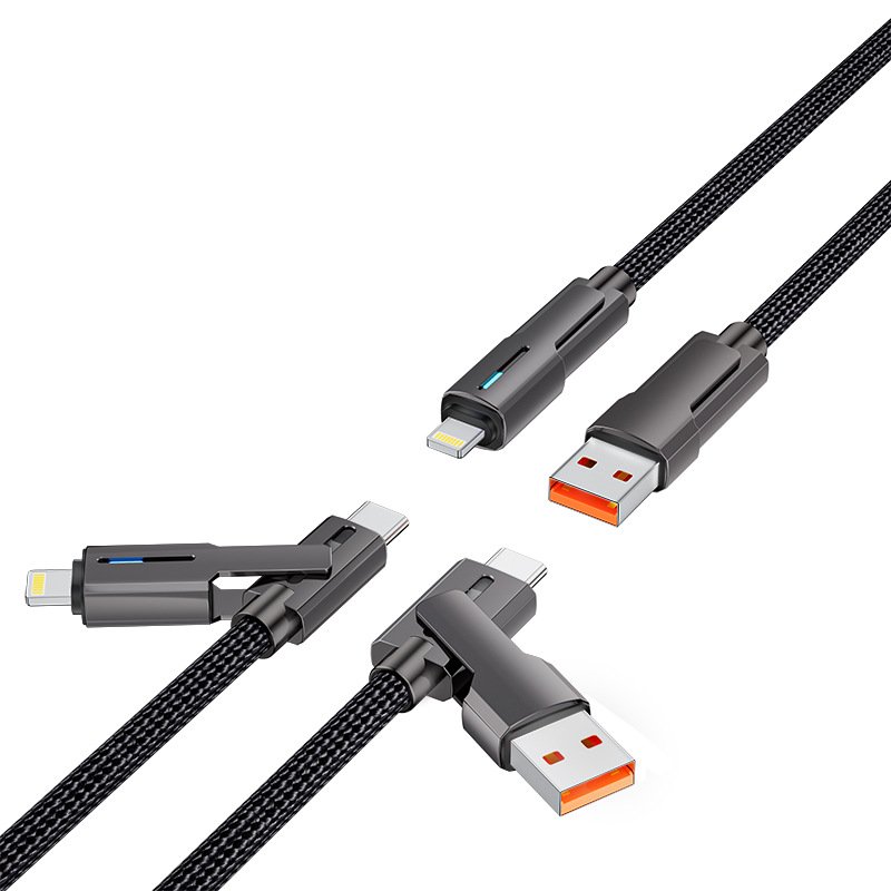- 4-in-1 rotating connector: USB-A + USB-C (source end), Lightning + USB-C (device end)